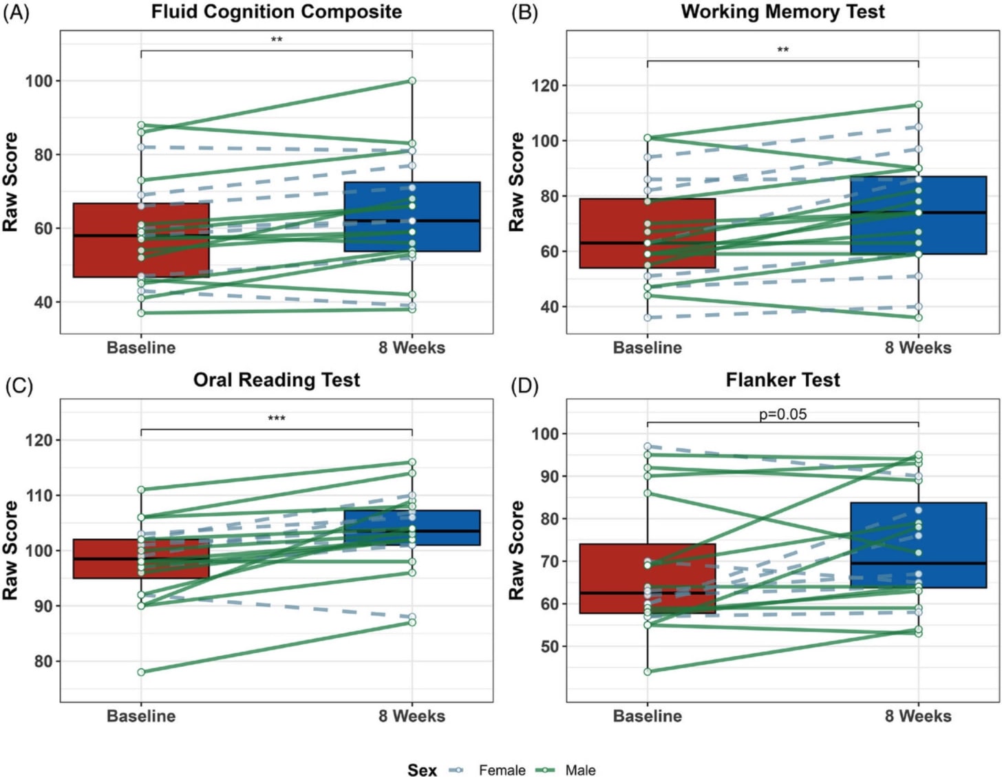 Change in cognitive measures after 8 weeks of creatine monohydrate supplementation. All scores were derived with the NIH Toolbox cognitive battery. Boxplots display values at baseline and 8 weeks, with individual changes overlaid. Solid green lines represent male participants, whereas dashed gray lines represent female participants. **p < .01; ***p < .001.