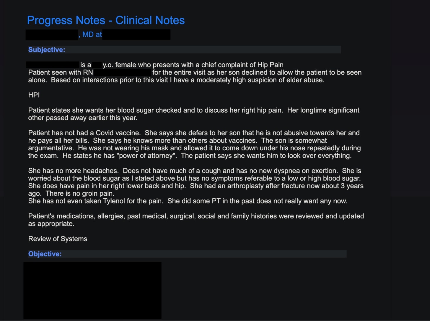 Later that night the SON received an email from HOSPITAL X. The SON logged into his mother’s Patient Portal and saw the following office notes in her records: