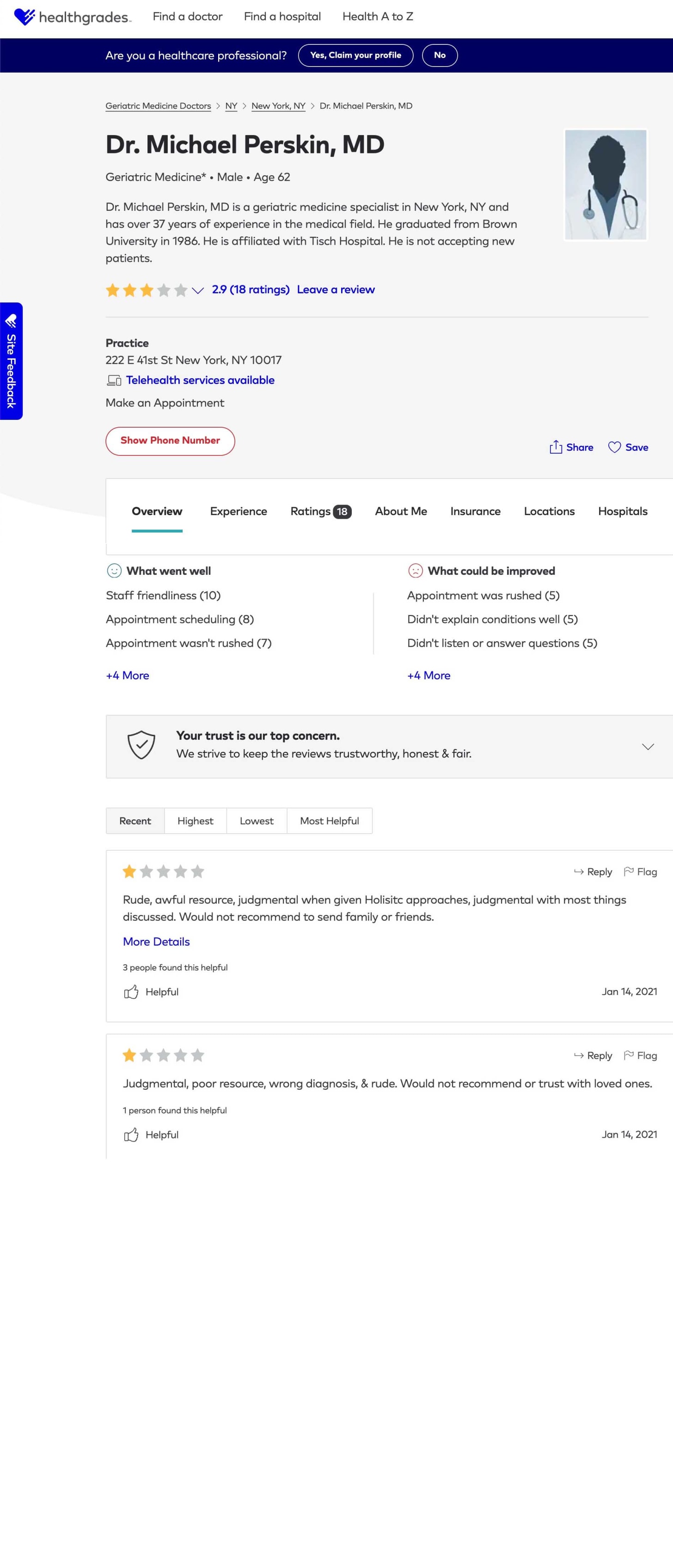 Dr. Michael Perskin’s online reviews are rather poor, though still far too high for the kind of iatrocide services he provides his elderly patients; to wit: