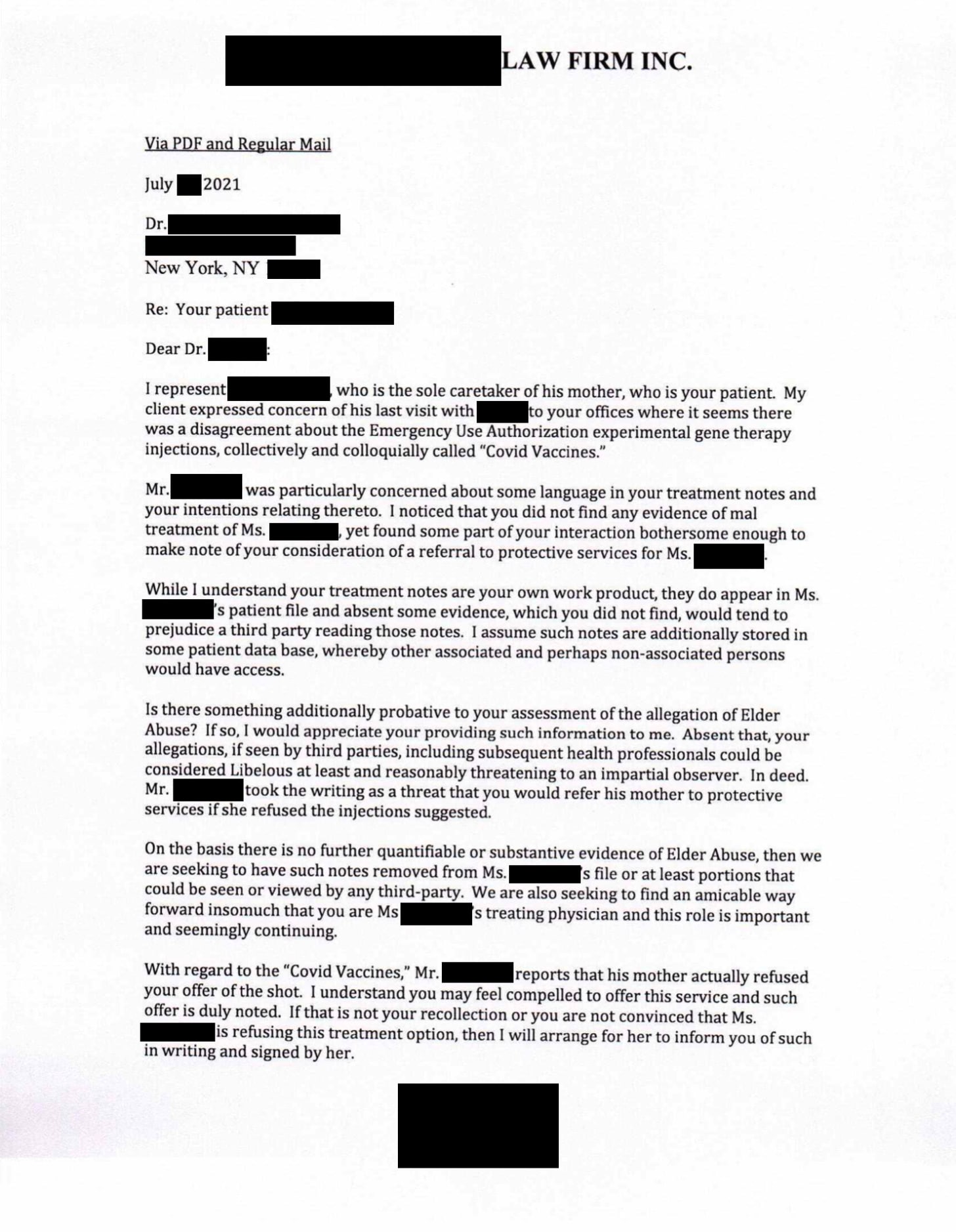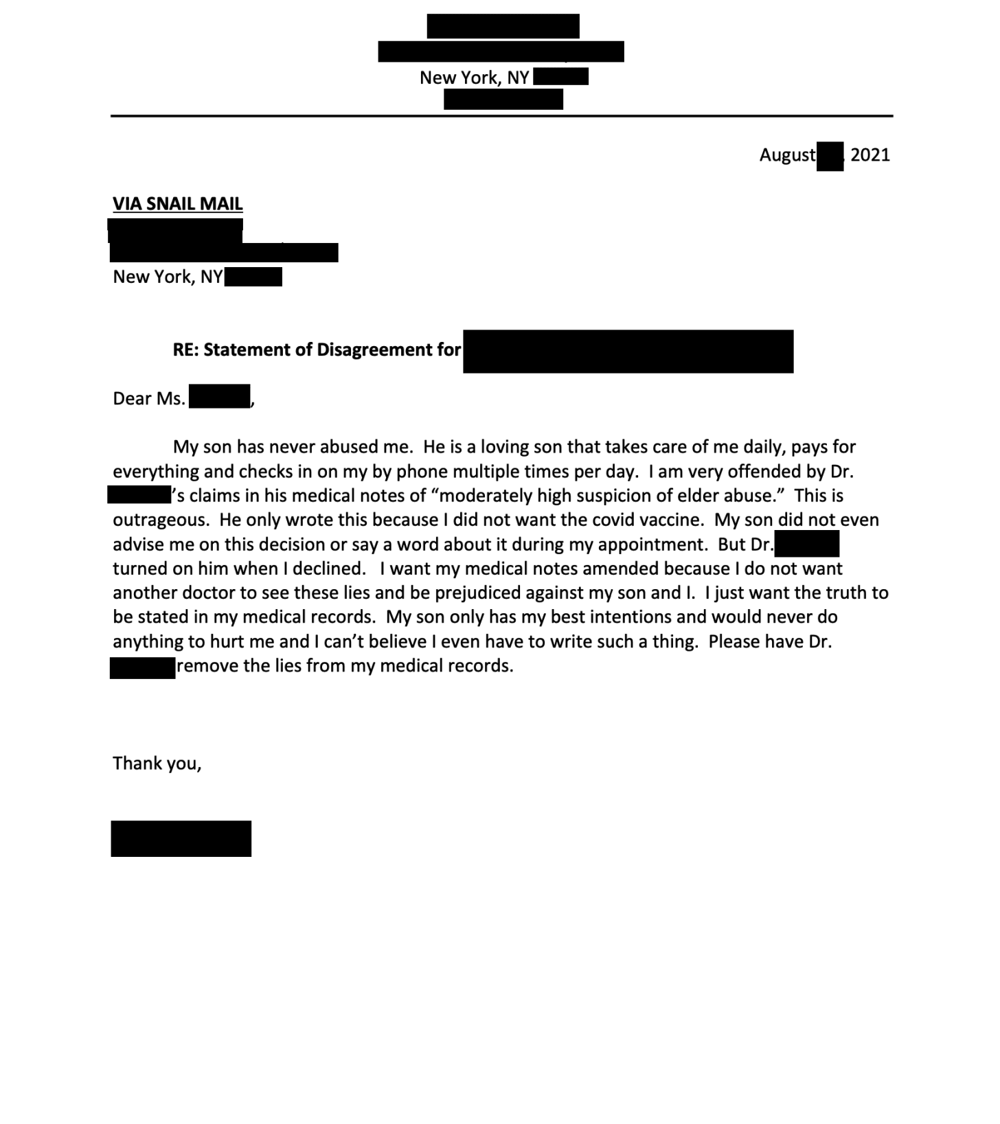 In mid-July 2021 an elderly yet vigorous lady by the name of G went to see her top NYC gerontologist at HOSPITAL X. For many years she was accompanied by her SON who had power of attorney, medical power of attorney, and was her sole caretaker.