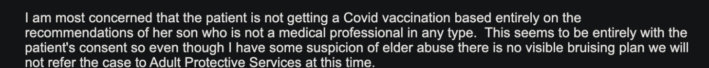Dark thoughts tormented him into the early morning hours. He asked himself how could this deranged quack write in his notes that he had no right to recommend a medical procedure to his own mother? How could a lucid woman’s wishes be so thoroughly dismissed? Why did this crazed doctor believe that the son had such power over his mother when she denied the EUA gene therapy shot? How can this sicko conflate the rejection of an experimental medical procedure with violent abuse? And so on and so forth.