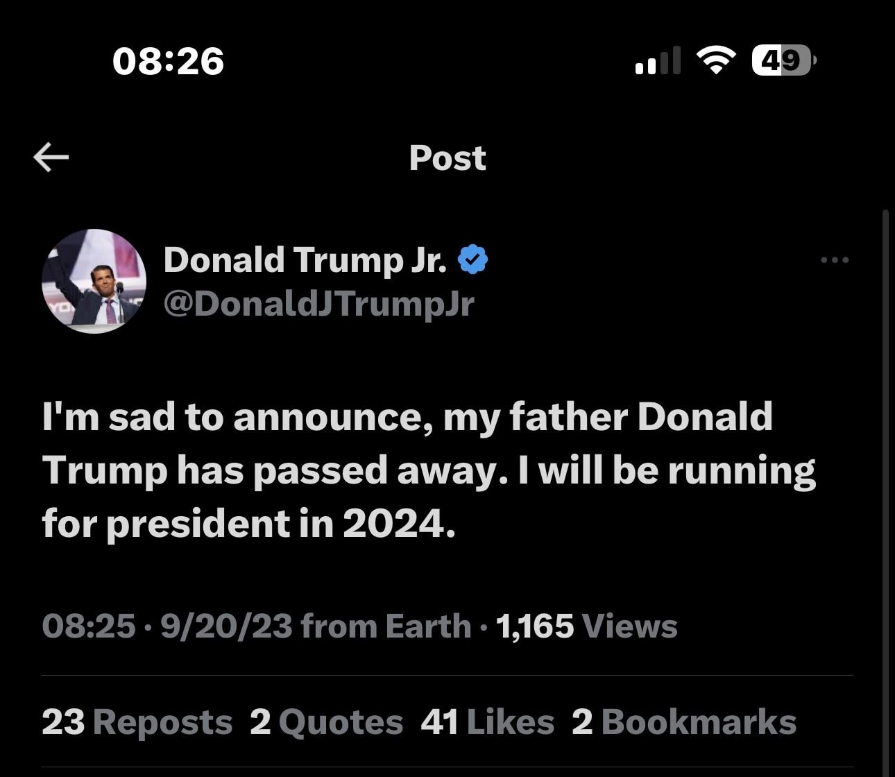 Post from Donald Trump, Jr on 9/20/23. Was this an admission of truth? Or some type of hack?
