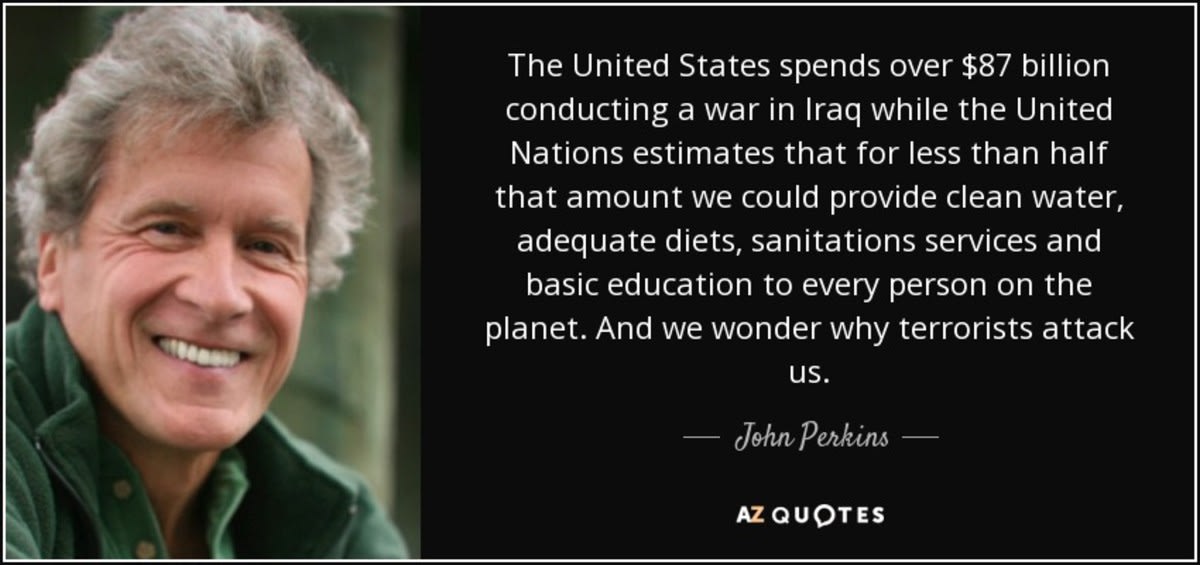 Economic hit men (EHMs) are highly paid professionals who cheat countries around the globe out of trillions of dollars. They funnel money from the World Bank, the U.S. Agency for International Development (USAID), and other foreign “aid” organizations into the coffers of huge corporations and the pockets of a few wealthy families who control the planet’s natural resources. Their tools include fraudulent financial reports, rigged elections, payoffs, extortion, sex, and murder. They play a game as old as empire, but one that has taken on new and terrifying dimensions during this time of globalization. I should know; I was an EHM.– John Perkins, 2004