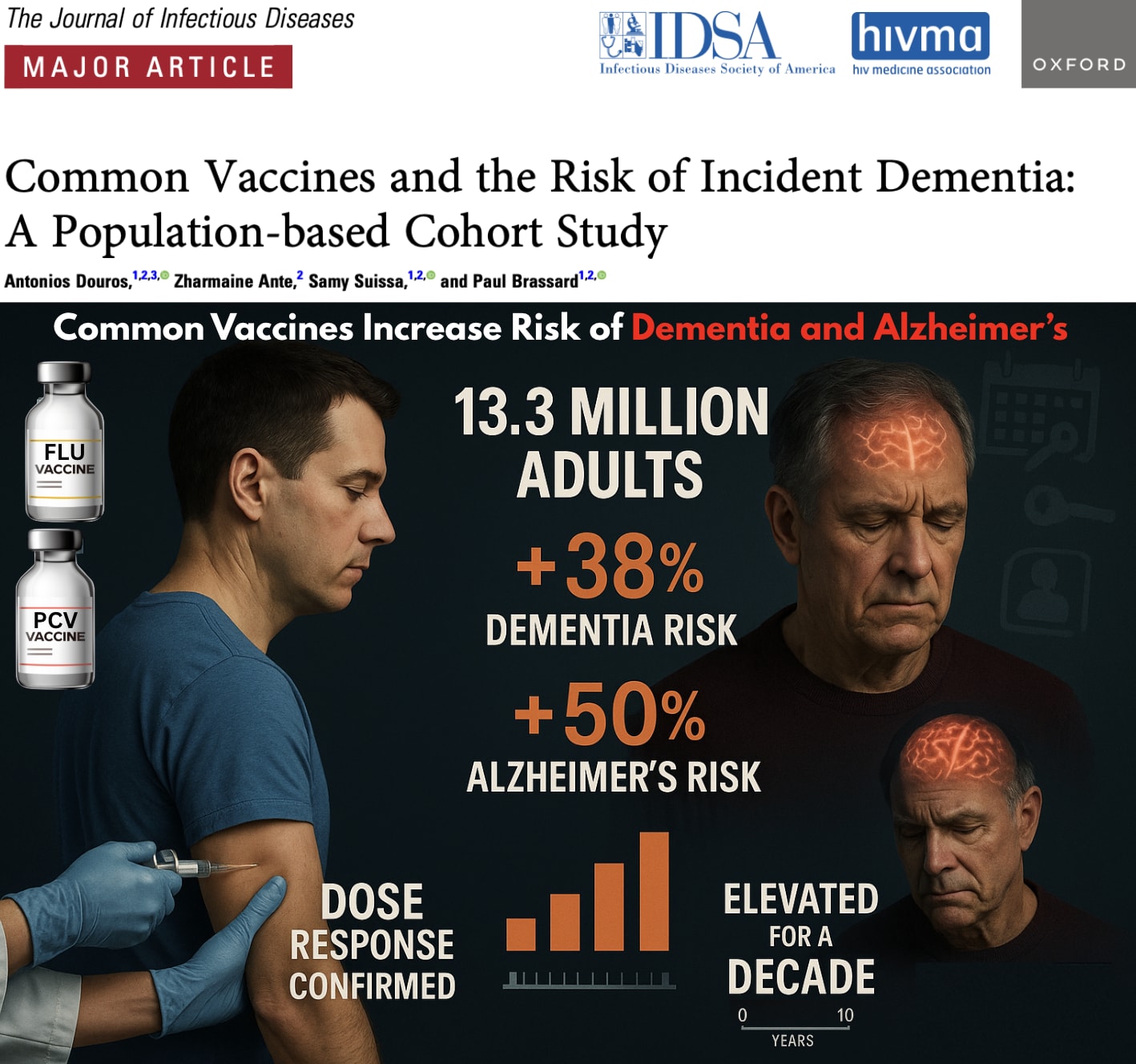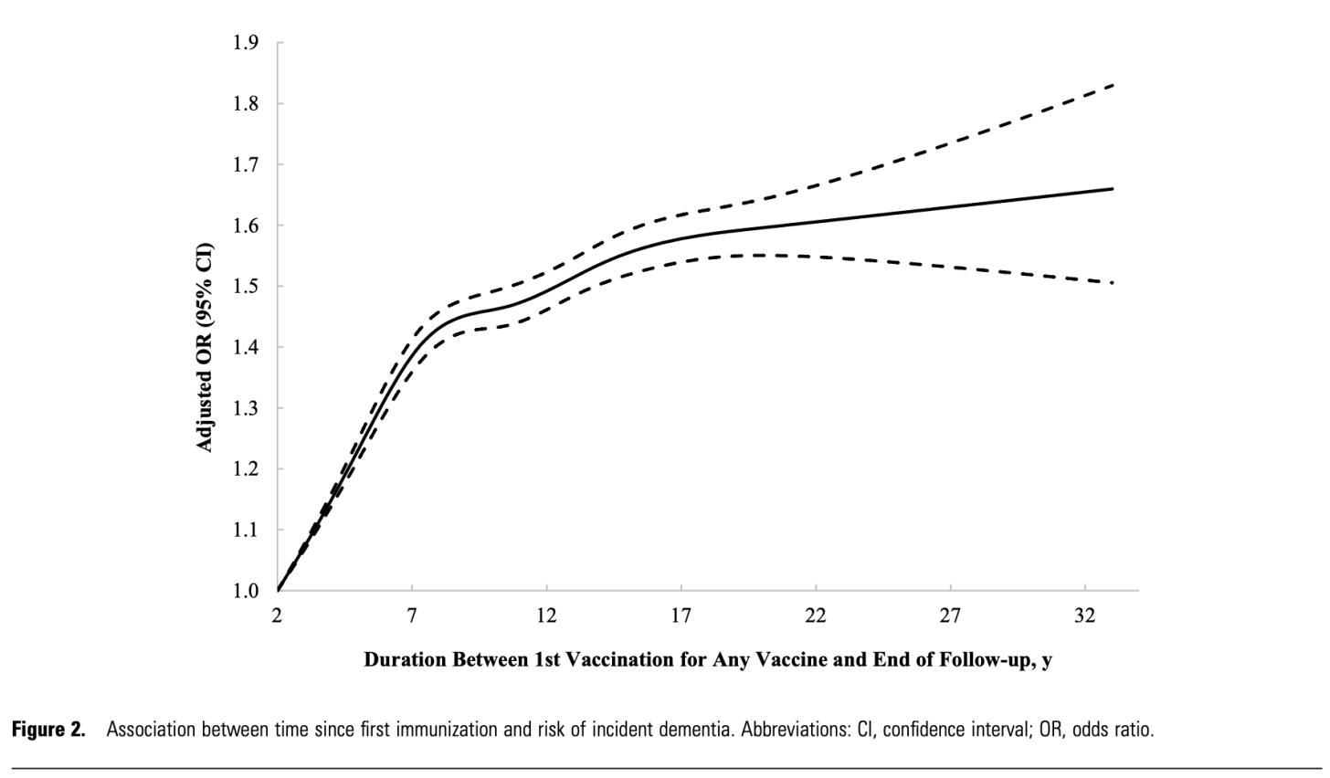 In the largest single study ever conducted on vaccines and dementia, common adult vaccinations were associated with a 38% higher risk of dementia and a 50% higher risk of Alzheimer’s disease. The risk increases with more doses, persists for a decade, and is strongest for influenza and pneumococcal vaccines.
